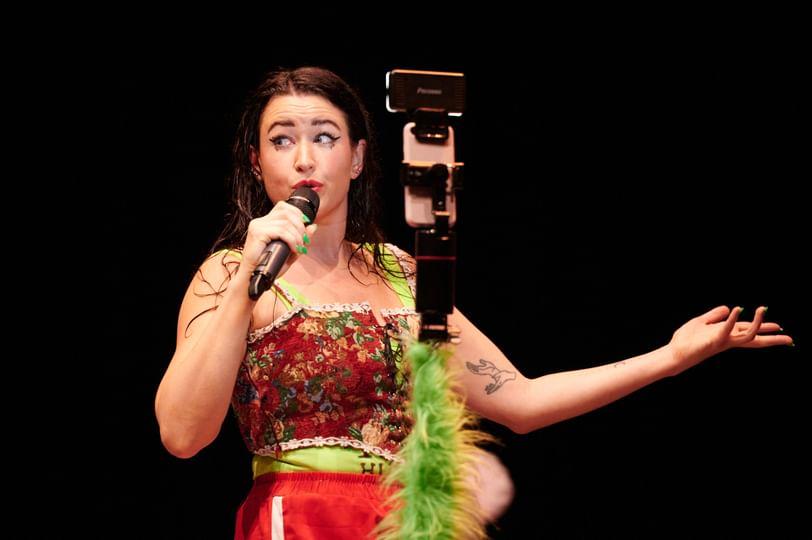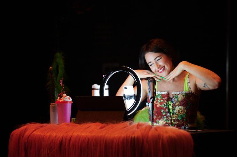 The style and form of Orwin’s show, with her interdisciplinary connections and associations with her junior TikTok mentor, raises the social critique of how performance art and theatre cannot completely fund an artist’s life. In a world where theatre is seen as an elitist form and contemporary theatre and performance art is not receiving the acclaim or funding that it deserves, artists need to fulfill multiple roles and jobs in order to survive day-to-day living. Orwin appeases each audience by providing something tailored to them: the TikTok audience sees a series of tasks and trends, complying to the demands and rules of the platform as to not be blocked, whilst the live audience experiences the energy, commentary and live music performance of the piece as well as hanging onto the suspense of whether the performer will reach 20k likes before she does something AMAZING.